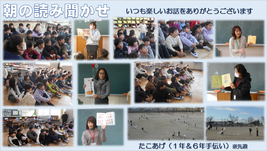 今日、朝の読み聞かせがありました。どのクラスも目を輝かせて聞き入る子どもたちばかりです。読んでいただく本が、季節や時期だけでなく子どもたちにぴったり合った本だからと思います。いつもありがとうございます。