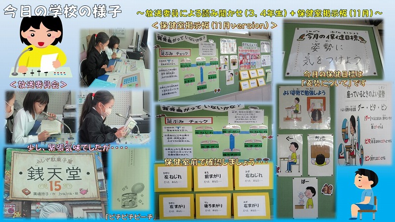 今日の学校の様子(放送委員読み聞かせ・保健室掲示板<11月>)