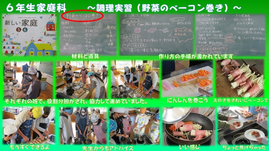 調理実習ですが、今年度は、5,6年生が実施できています。6年生は班の中で、