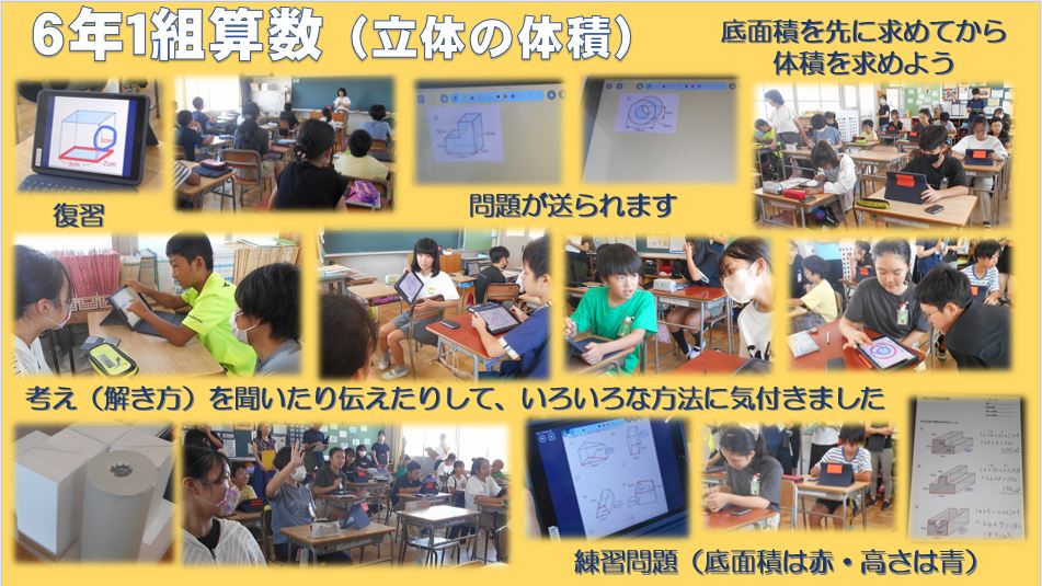 。グループで伝え合ったときは、個人の考えが違うことが多く「なるほど」「そんな方法もあるんだ」という声が聞かれました。タブレットで考えを選択・共有したり、実物の立体模型を見たりするなど、まず底面積を見つけてから体積を求めるとよいことを理解しました。