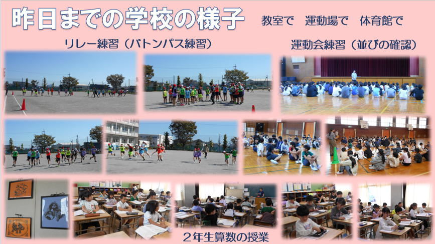 先週と昨日の学校の様子です。運動場ではリレー練習、体育館では運動会種目の整列場所の確認、教室では算数の授業と、それぞれ計画的に進んでいます。落ち着いて取り組むことができています。