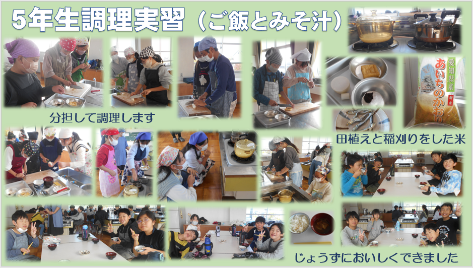 今日の1・2時間目に2組が、3・4時間目に1組が家庭科の調理実習でご飯とみそ汁を作りました。ご飯は、5年生が農業委員とJAの方のご協力で田植えと稲刈りをした米をいただいて、鍋で炊きました。みそ汁は煮干しで出汁をとる方法です。おいしくじょうずに作ることができました。後片付けや実習のまとめもしっかりできました。