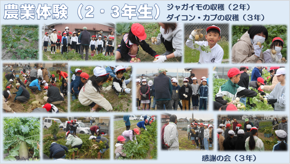 昨日、農業体験がありました。2年生がジャガイモの収穫、3年生がダイコンとカブの収穫です。(今年の暑さでダイコンの生育が悪く3年生は昨日に延期していました)農業委員さんにお世話をしていただいたおかげで、今年も無事収穫することができました。