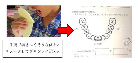 子どもたちはまず、手鏡を使って、自分の歯の状況を確認し、磨きにくそうな箇所をプリントにチェックしました。続いて、歯ブラシの毛先がしっかりと歯に当たるように、鏡を見ながら磨いてみました。子どもたちは皆、真剣に取り組み、この日の学習を家庭でも生かしてくれるに違いありません。