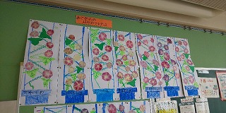 朝、校内を回っていますと、給食配膳室の屋根に雑草が生えていました。これも長雨の影響ですが、湿気をエアコンが除去してくれるおかげで、快適な環境で学習を進めることができています。教室掲示も初夏らしく、1年生の教室では、「アサガオの押し花」をつかった作品が飾ってあり、癒しを与えてくれていました。