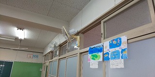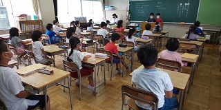 新型コロナウイルス感染が拡大傾向にあることを受け、「新しい生活スタイル」の徹底を改めて指導していますが、エアコンが完備された教室では、対角線に扉と窓を開けるだけでなく、扇風機で空気の流れを作って、換気を助けるように配慮しています。在籍児童数が多い3年生や6年生の教室は、机を目いっぱい広げて配置していますので、隙間なく子どもたちが座っているように見えます。
