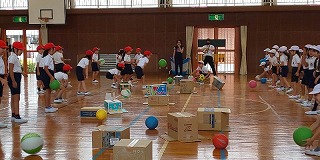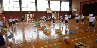 座って学習を続けるばかりでは子どもたちもストレスをため込んでしまいます。健康確認と事前事後の手合いの徹底をして、今日のような気温の場合、体育館での体育の授業にも取り組んでいます。3年生は合同体育で、ソフトバレーバールを使った「的当てゲーム」を楽しんでいました。センターラインに配置された段ボールにボールを当てて相手陣地へ押し込むわけですが、的をねらう子とボールを回す子が連携し、的を押し合っていました。