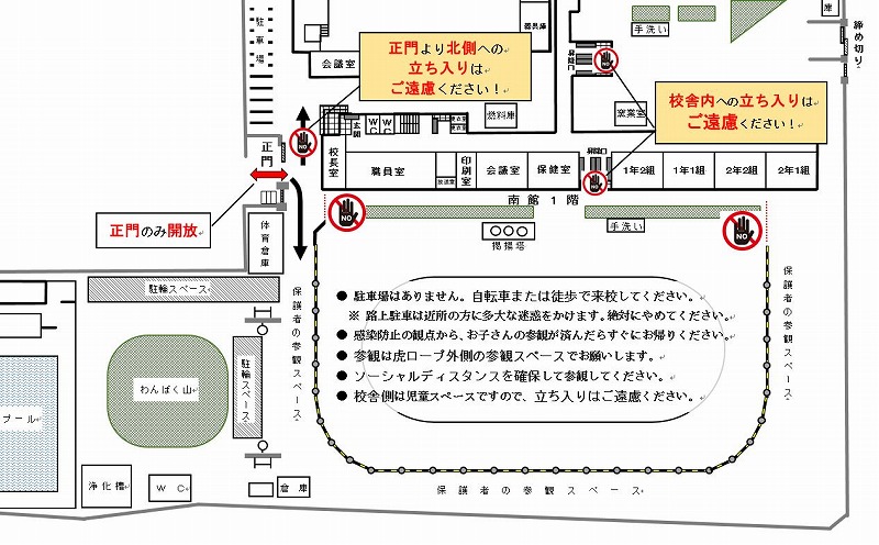 なお、新型コロナウイルス感染防止の観点から、ご家庭で検温、健康確認の上、マスクを着用して来校してください。指定の区域以内への立ち入りは固くお断りします。また、お子様のそばへ立ち寄りもご遠慮ください。