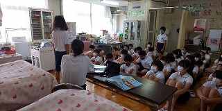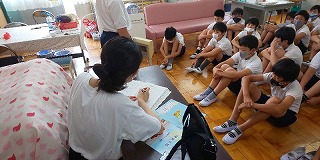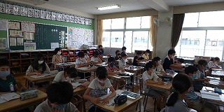 考えを深め合う場を設定していました。熱中症防止のために子どもたちはマスクを外していますので、扉を全開にした出入り口付近で議論するよう配慮をしています。