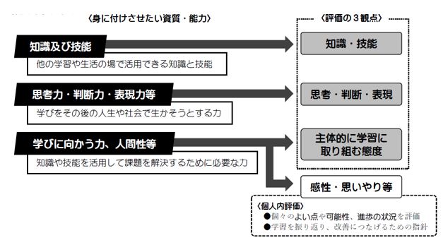 下の模式図にもありますが、新しい学習指導要領では、子どもたちに身に付けさせたい資質・能力を「知識及び技能」「思考力・判断力・表現力」「学びに向かう力、人間性等」の3つに再整理しています。それに基づいて、3つの新しい観点で、単元ごとに目標に対する個々の達成度を評価していきます。