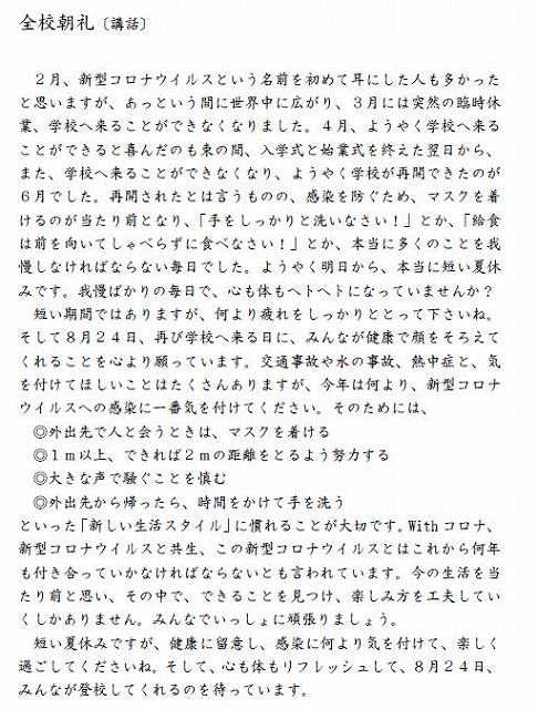 さて、本日は、夏休み前最後の日ということで、放送による全校朝礼を実施しました。校長先生から以下のようなお話があり、教室では、子どもたちが姿勢を正して聞いてくれていました。