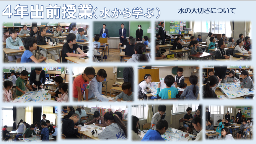 昨日の午前中、4年生が出前授業でした。株式会社LIXIL(リクシル)様にお越しいただき、「水」について学習しました。水は限られた資源で世界中をめぐっていること、安全な水を飲んだり使ったりできる国とそうでない国があること、食物を育てるために大量の水を使うことなど、知らないことをたくさん教えていただきました。水を大切に使うために自分たちにできることは何か考えることができました。