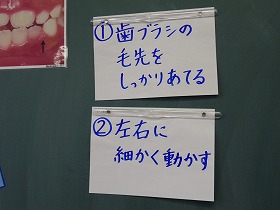 磨きにくいところを確認した後、きちんとした歯磨きの仕方を教えてもらいました。正しい歯磨きには、歯ブラシが大切で、先が広がっていない歯ブラシで、毛先をしっかりと歯に押し付け、細かく磨くことが重要なことを皆で確認し、実際に磨いてみました。子どもたちはは真剣な表情で学んでくれ、この日の学びを今後に生かしてくれることと思います。
