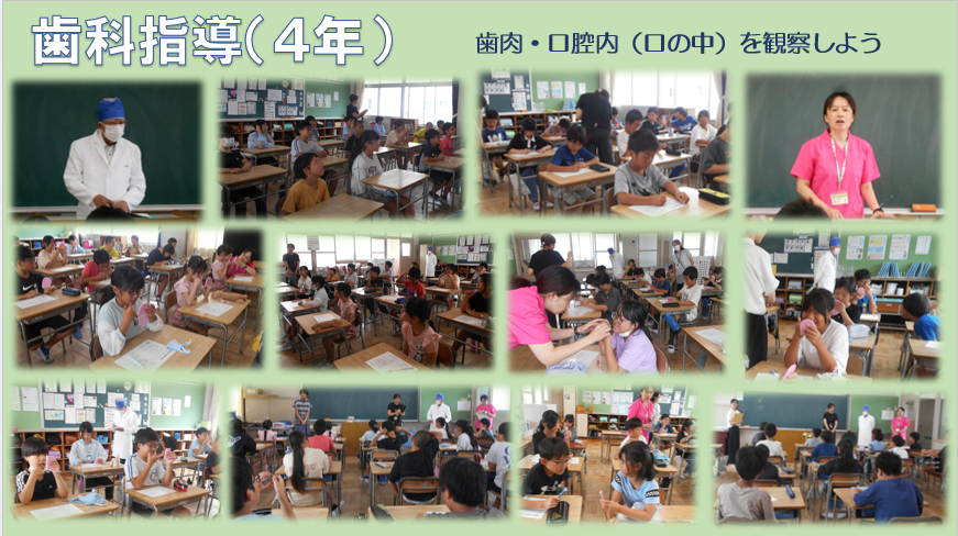 今日の1・2時間目に4年生の歯科指導がありました。4年生は、これまでの歯のことだけでなく、歯肉について学習します。まずは、自分の歯肉の状態の観察です。歯肉は歯の土台であり、適切な歯みがきで歯肉炎の予防ができます。歯ブラシをしっかり当て、細かく、工夫して磨くことが大切だと教えていただきました。