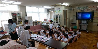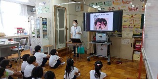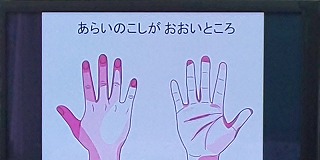 体重測定を順次実施していますが、この日は朝から1年生の子どもたちの測定日でした。マスク着用で私語なしでの実施も「当たり前のこと」となってきました。これも新しい学校スタイルのひとつで、皆、慣れてきました。測定終了後、養護教諭が保健指導として、「手洗いの仕方」をテーマに取り上げて行っていました。洗ったつもりでもこれほど多くの洗い残しが出てしまうことが多いことをスライドで見せながら、正しい手洗いのポイントについて指導しました。