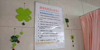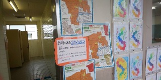 校内には様々なねらいで多くの掲示がされています。保健室の休息用ベッド付近の壁面には、「自分を好きになるトレーニング」が掲示され、保健室は心が疲れて来室する場合も多いので、そんな子たちの助けとなることを願って養護教諭が準備しました。3年生のトイレ入り口には「あま市にある公共施設」の地図が掲示してあり、皆が目にする機会が多い場所に掲示することで、社会科の学習の助けとなればと担任は願っています。