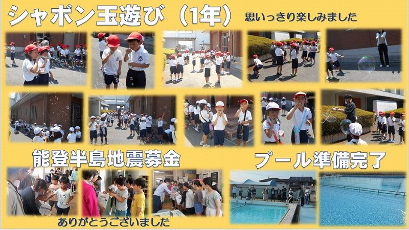 今日の2時間目、1年生が生活科の授業「なつとなかよし」でシャボン玉遊びをしました。息の吹き方を変えながら、小さなシャボン玉や大きなシャボン玉を飛ばし、中には飛んでいくシャボン玉を夢中で追いかける子もいました。たくさんのシャボン玉に、皆が笑顔になりました。