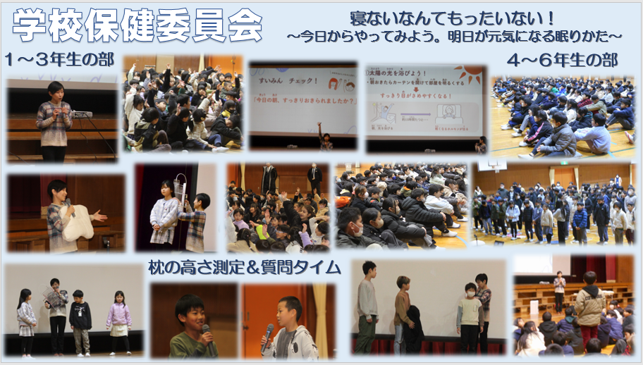 今日の5・6時間目に、学校保健委員会を行いました。「眠りの店サカタツ」と「西川株式会社」より講師をお招きして、睡眠について学習しました。眠ることの大切さやぐっすり眠るための手立てなど、学年に応じて分かりやすく教えていただきました。たくさん眠るよりもしっかりぐっすり眠ってすっきり起きることの方が大切だそうです。きっと教えていただいたことを家の人に話したり、今日の夜から実践したりすると思います。明日はすっきり起きて元気に登校してくださいね。