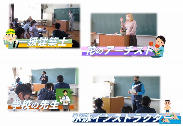 今年度は、新型コロナウイルス感染防止の観点から、「技」を見せていただいたり、教えていただいたりする機会を自粛せざるを得ませんでしたが、多方面で活躍してみえる8名の方々を講師として招く、お話を聞く機会を作ることができました。講師の方々からは、仕事のやりがいや生きがい、苦労とともに、人と温かくかかわることの素晴らしさや、責任ある仕事をするために人としてどうあるべきかといったことについても話を聞かせていただくことができました。子どもたちはそれぞれに、今の自分をふり返り、自分の生き方を考える機会として素晴らしいひと時を過ごす超すことができました。