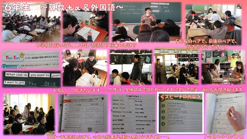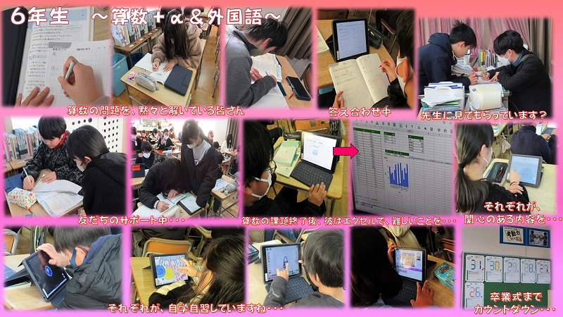 が掲示されていました。そんな中、それぞれのクラスでは、6年生が集中して学習に取り組んでいました。
