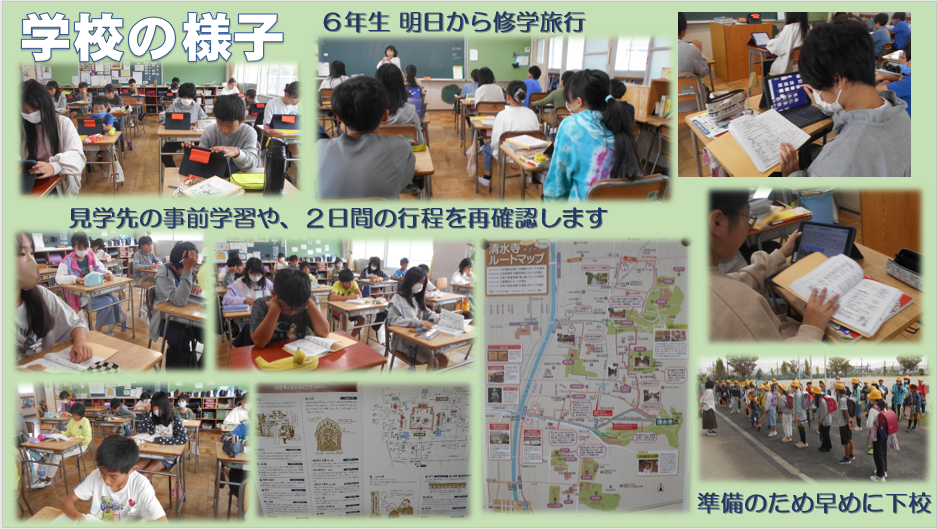 昨日、6年生が修学旅行に向けて事前学習を行っていました。見学先の見どころを調べたり、しおりを再確認したりしていました。明日からいよいよ修学旅行です。学びのある、そしてよい思い出になる修学旅行にしたいですね。