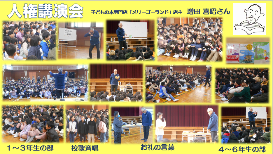 先週の金曜日に「人権講演会」を実施しました。人権週間(12/4~10)にあわせて講師の方にお話をしていただきます。今年は、2年前にも来ていただいた「メリーゴーランド」という子どもの本専門店の店主増田喜昭様でした。希望された保護者や「おはなしトトロ」さんも参加しました。特技のコマ回しの披露からゲーム、読み聞かせなど、あっという間の45分間でした。子どもたちの心が豊かになったと思います。ありがとうございました。