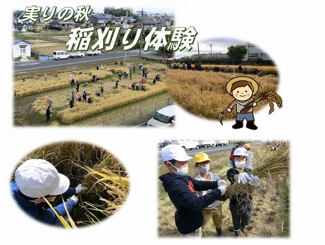 寒気が入ったため風が吹き、寒い日となりましたが、5年生が農業体験の一環として稲刈りを行いました。JA海部東部の皆様とPTA顧問を務めてくださっている鈴木さんのご厚意で、「首を垂れる稲穂かな」と詩にも詠まれるようにしっかりと実ったお米の収穫体験をさせていただくことができました。例年なら、初夏に田植えの体験をし、その稲をこの時期に刈り取るわけですが、コロナ禍で、稲刈りのみの体験となりました。ぬかるむ田んぼにおっかなびっくり入り、恐る恐る稲を刈り取った子どもたち、お米がここまで育つまでの苦労話も聞かせていただき、今日は家庭で、そんな話をしながら夕食を囲むことでしょう。