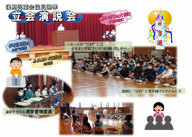 10月19日より後期に入ります。学校や学級の諸活動を引っ張ってくれている役員の改選の時期を迎えました。この日は児童会役員選挙投票日で、1限に選挙権をもつ4年生以上の児童が体育館に集まり、立会演説会を開きました。窓や扉を全開にし、演説を聞く子どもたちは会話をせず、前後の間隔を十分に取らせての会としました。また、演説をする舞台上との距離が十分に保たれているので、立候補者にはマスクを取らせ、表情まで見えるようにしました。立候補者が掲げる公約からは、よりよい学校づくりへの熱い思いが感じられ、どの子が当選しても、Withコロナの新しい学校づくりに力を尽くしてくれると確信しました。