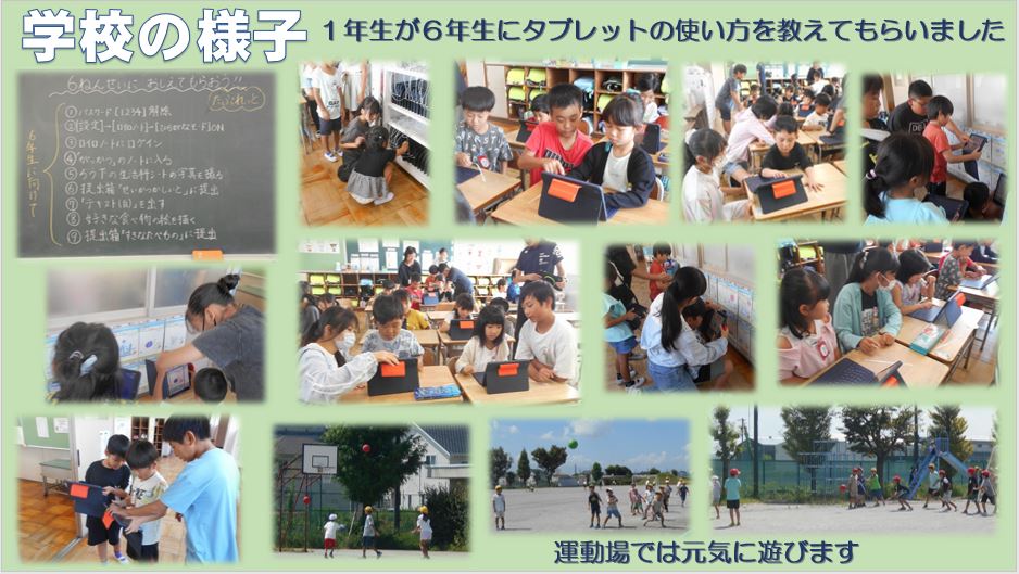 今日の3時間目、1年2組が6年2組にタブレットの使い方を教えてもらっていました。タブレット庫からの出し方、持ち方、ログインの仕方、写真の撮り方などを教えてもらいました。6年生は、担当した1年生に優しく説明しながら上手に教えていました。さすがです。