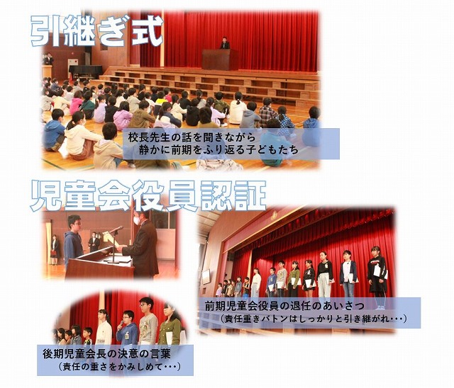 前期が終わり、今日から後期です。この日は、「今の自分をふり返り、目標を新たにする」ための式「引継ぎ式」と後期の児童会役員・学級委員の認証式を行いました。