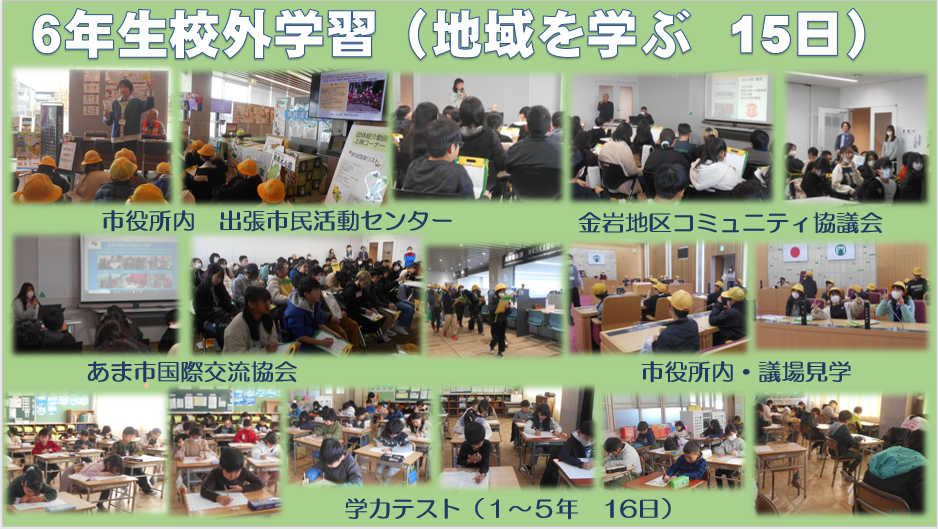 昨日の5・6時間目に、6年生が市役所に校外学習に行きました。隔月の第三水曜日に実施される「出張市民活動センター」の見学です。また、市役所の各課の協力で、会議室でお話を聞いたり議場を見学したりすることができました。市民活動センター、金岩地区コミュニティ協議会、あま市国際交流協会の活動を教えていただき、地域でさまざまな活動をしていることを知ることができました。今後、地域のために活動できるといいですね。