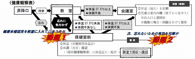 日々の健康管理(確認)に他なりません。検温を忘れない、健康観察表を忘れずに持ってくる。些細なことと感じられる方もあるかと思いますが、これを忘れないという