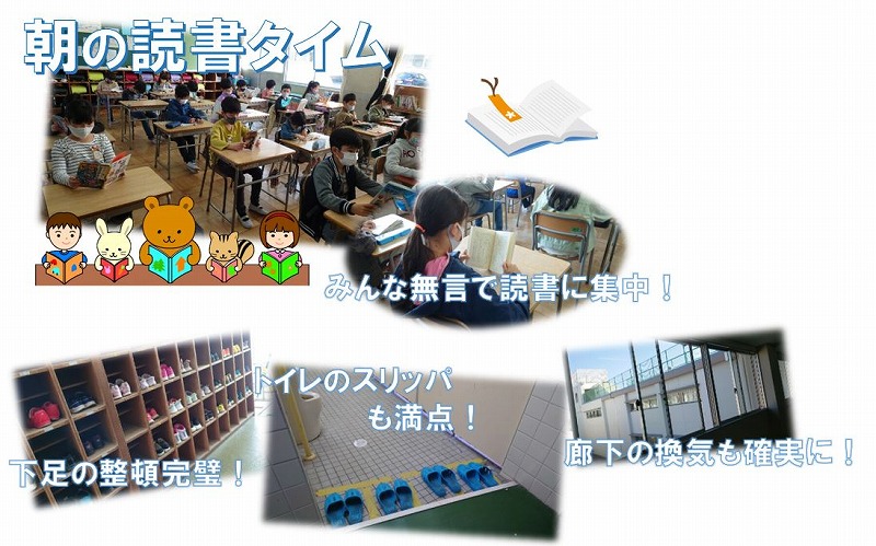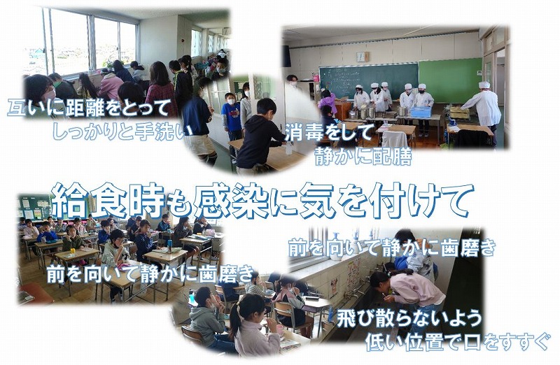 1年生は4日目、2年生以上は3日目を迎え、感染に気を付けながらも、子どもたちは少しずつペースをつかみ、いつもの日常が戻ってきました。感染リスクが高いと言われる食事の時間は、十分に注意を払うようにしています。狭い手洗い場ですが、できる限り距離を保たせ、ていねいに手洗いした後、アルコール消毒もしています。準備中は、給食当番はもとより、全員がマスク着用でおしゃべりを慎んでいます。マスクを外す会食時は、前向きでおしゃべりをせずに食べています。味気ない食事ですが、コロナが収まるまでは我慢です。