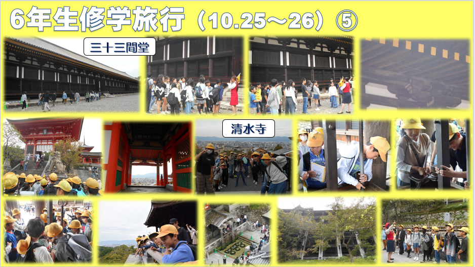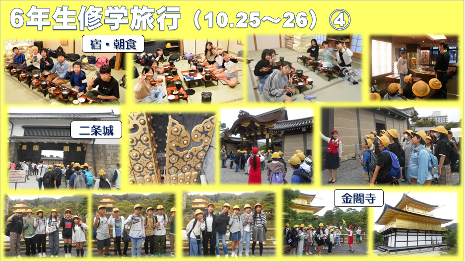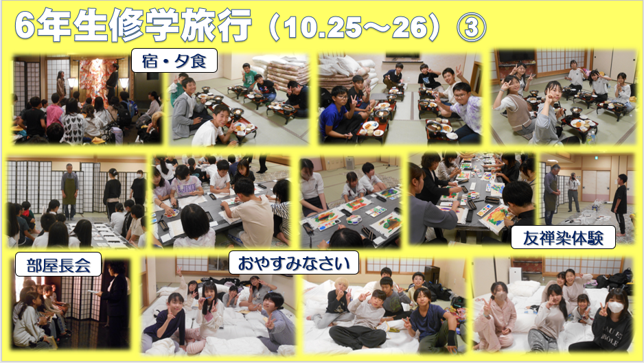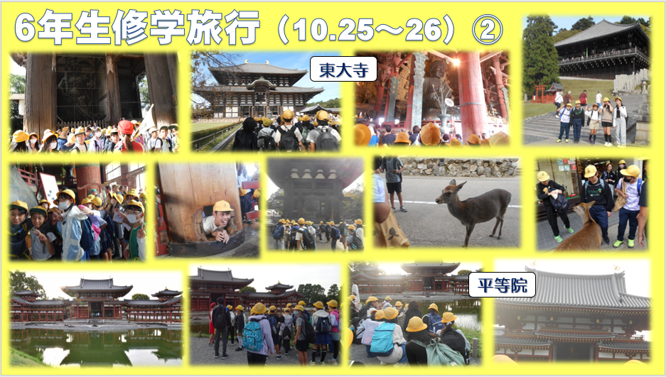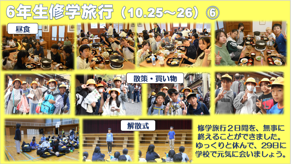 10月25日・26日に、6年生が修学旅行に行きました。見て・聞いて・体験して、たくさんのことを学習しました。また、2日間ずっと一緒に過ごすことで、仲間のよさを再確認したことでしょう。これからの学校生活に生かしてくださいね。