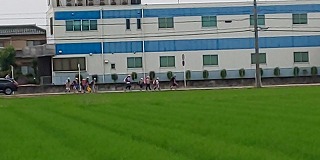 〈見守り隊の方に見守られて安全に横断〉 〈どの通学班も前後の間隔に気をつけて〉