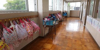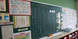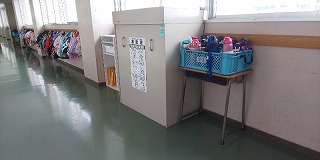 感染への危機管理と授業の充実、災害への備え等を並立させるべく様々な心配りをしています。例えば、在籍数の多い学年は、廊下に水筒置き場を移動して座席間を広くとるようにし、子どもたちの集中力を妨げないように前面掲示板をすっきりとさせています。背面黒板には、「手洗いや洗顔」の励行を呼びかけが書きこまれ、緊急時に備えて、3階廊下には「直下型救助袋」が設置されています。