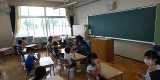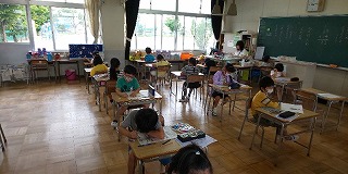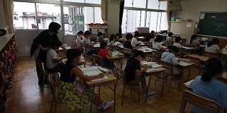 9時30分頃から雨が降り出しましたが、子どもたちは落ち着いて授業に取り組んでいます。1年生では外国人ALTを迎えての外国語活動で英語じゃんけんに挑戦し、2年生は国語の確認テストに集中して取り組んでいました。