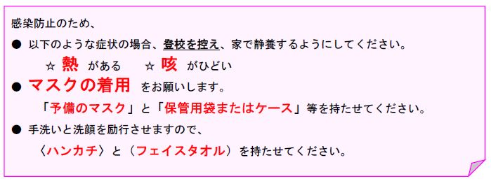 〈持ち物〉 連絡袋同封の学年ごとの「持ち物連絡文書」をご確認ください。
