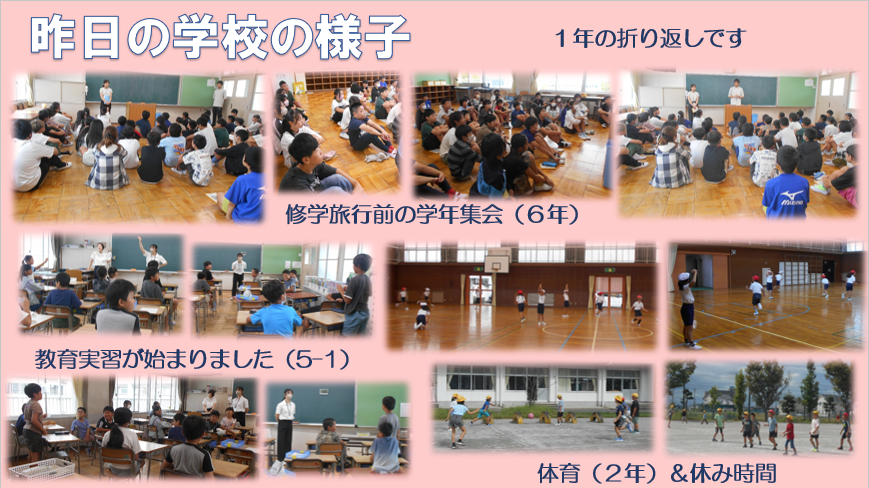 昨日の学校の様子です。6年生は修学旅行前に学年集会を行い、最後の準備をしていました。また、昨日から3週間、教育実習(先生になるために現場で学ぶ)が始まりました。5年1組を中心に生活します。よろしくお願いします。体育や休み時間に元気に運動しています。