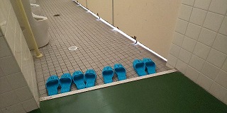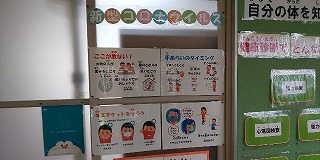 〈この日はトイレのスリッパも完璧!〉 〈保健室前には感染予防の呼びかけ掲示〉