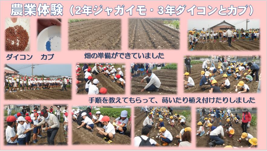 1時間目に3年生がダイコンとカブの種を蒔き、2時間目に2年生がジャガイモの植え付けをしました。