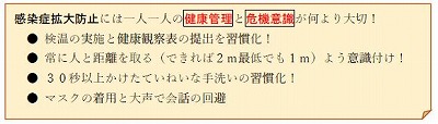 感染するリスクは低くなると考えます。ぜひ、検温の実施と健康観察表の提出の習慣化にご協力をよろしくお願いします。月曜日、全校児童が元気に登校しくれることを心より願っています。