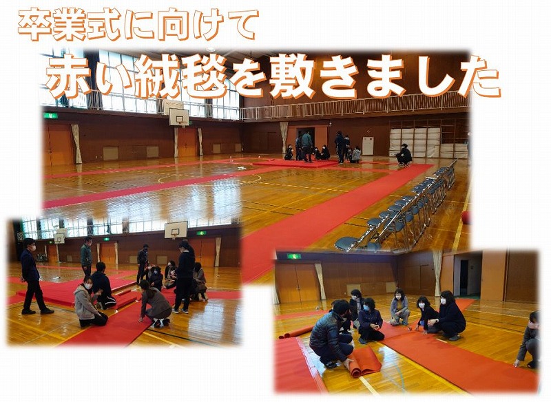さて、卒業式に向けたの練習も始まっており、懇談会終了後、先生たち総出で卒業式会場づくりをしました。証書授与のために一人ずつ演台に向かう子どもたちのための「花道」となる赤い絨毯を敷き詰めました。これで明日からは、本番同様の雰囲気の中、練習に取り組むことができました。懇談後、疲れているはずの先生たちですが、素敵な最上級生に成長してくれた6年生のために、少しでも良い会場にと話し合いながら会場を作ってくれました。