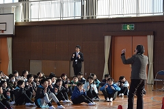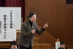 学校保健委員会 今日の授業公開の5時間目に、学校保健委員会を行いました。参加学年は、3年生と4年生です。 上級教育カウンセラーの奥村桂子先生をお招きし、「クラスの団結・笑顔の仲間作り」~ソーシャルスキルを使って~を題目に、講話をしていただきました。 ゲームを交え、クラスの交流を図ったり、大きな声で手遊び歌を歌ったり、児童は笑顔で楽しく活動することができました。 温かい言葉がけ、元気な声、○○名人になることなど、多くのヒントをいただきました。