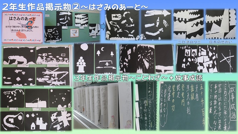 2年生作品(はさみのあーと)+3年生作品(ことわざ)+黒板