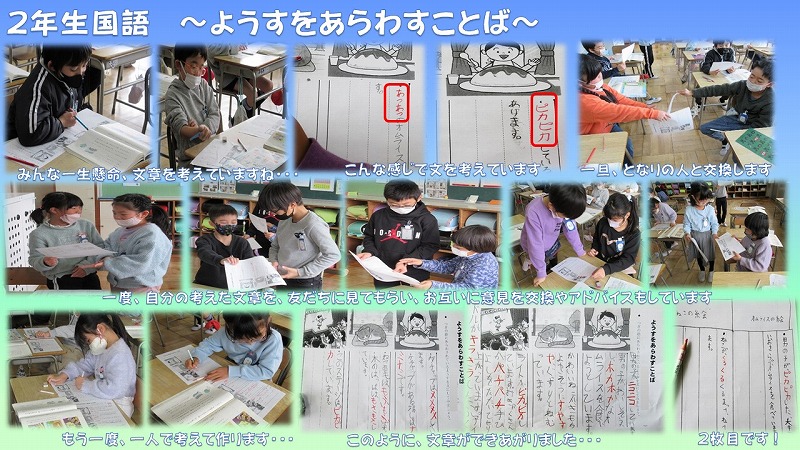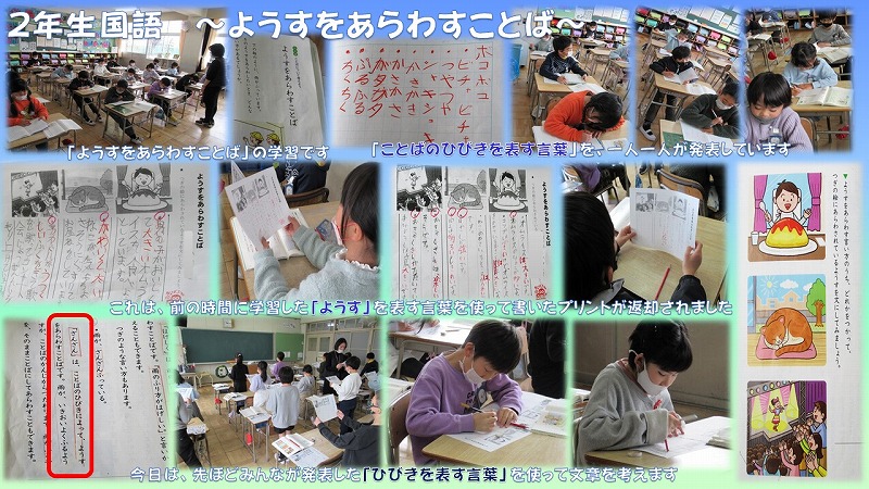 様子を表す言葉の学習でした。プリントは前の時間と同じプリントを使い、
