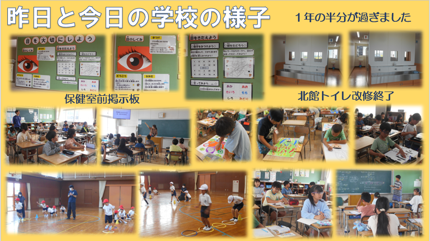 昨日と今日の学校の様子です。10月に入り、保健室前は目に関する掲示物になっています。また、北館トイレの改修が終わり使えるようになりました。校内では、さまざまな学習に取り組んでいました。みんな楽しそうに集中して活動しています。