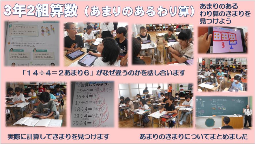 先週の金曜日の4時間目に、3年2組で算数の研究授業を行いました。あまりのあるわり算で、あまりにはどんなきまりがあるかを考えました。タブレットに配付された図に考えをかき込んで友達と話し合いをしました。友達や先生の意見を聞いて「あまりはわる数より小さい」と理解することができました。