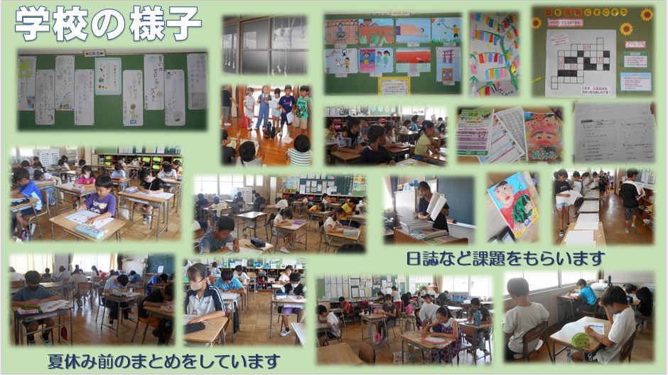 夏休み最終日前日になりました。今日も学校はいつもどおりです。テストをしているクラスや学習をしているクラス、夏休みの課題を受け取っているクラスもありました。夏休み中、ご家庭でよく相談して、学年に応じた課題だけでなく、自由応募の課題にも取り組んでもらえるとうれしいです。よろしくお願いします。梅雨が明け、いよいよ明日が夏休み前最終日です。明日も元気に学校に来てくださいね。(ある子から「ホームページの写真が小さい」と教えてもらいました。ありがとう。少しは見やすくなったでしょうか?)