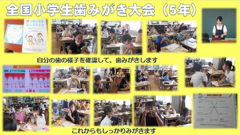 歯科指導の一環で、5年生が「全国小学生歯みがき大会」に参加しました。小学生でも「歯肉炎」が拡がっていること、歯と歯のすき間にプラーク(歯垢)が残ること、基本的な歯みがきの仕方などを学習しました。「キラリと光る白い歯とキリッと引き締まったピンク色の歯ぐき」を続けていきたいですね。